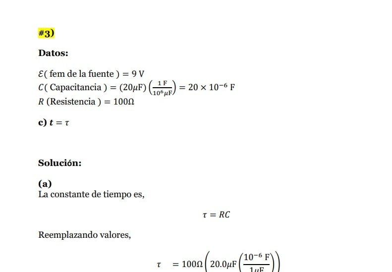 Solución: Un capacitor descargado y un resistor están conectados en serie a una fuente de fem. Si VFEM =9.00 V,C=20.0μF, y R=100Ω, encuentre (a) la constante de tiempo del circuito,